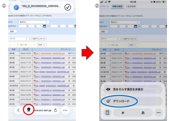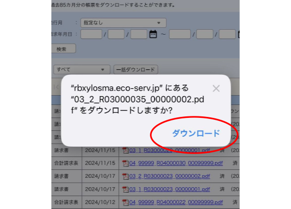明細のPDF(赤い書類マーク)を押すと左のようなダウンロードを確認する画面がでるので、ダウンロードを押してください。
