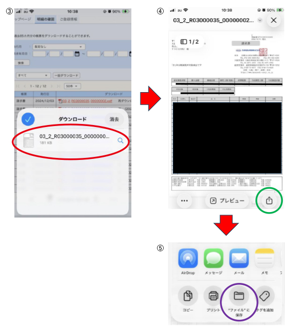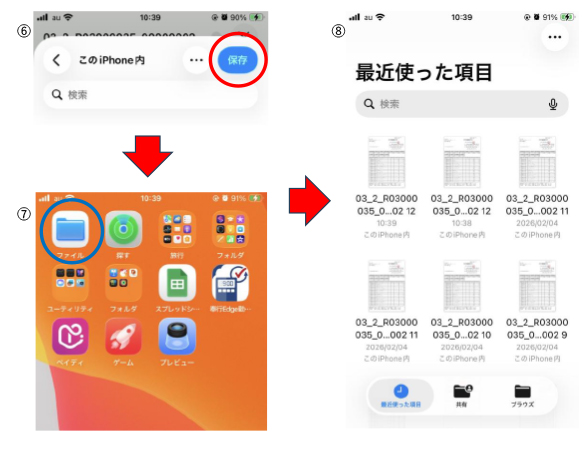 図⑥の画面になったら、青い保存ボタンを押してファイルにiPhoneに保存してください。ここまで行っていただいて初めて、明細をiPhoneに保存することが出来ます。 iPhoneに保存が出来たらホーム画面に戻って、ファイルのアイコンを押してください。図8のようにPDFを確認することが出来ます。