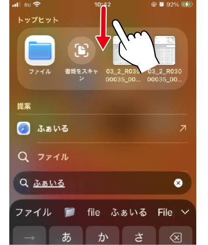 ※ファイルのアイコンがどこにあるかわからない場合は、下にスワイプして(指で下に画面を引っ張って)検索バーに「ファイル」と入力すれば出てきます。