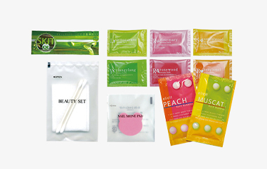 ハブラシセット・カミソリ・ブラシ・クシ・ヘアバンド・シャワーキャップ・スリッパ・フェイスマスク・コットンセット・脂とりがみ・入浴剤・ネイルシャインパッド・ハンドクリーム・アルコールシート・鼻パック・バスバブル・洗口液&清涼フィルム・快眠&集中アイテムなど