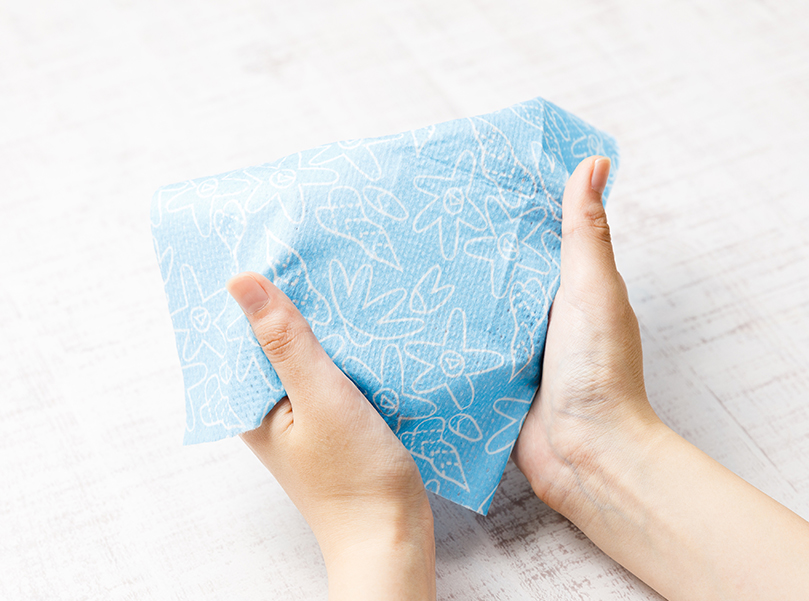 紙おしぼりの「安っぽさ」を払拭し、布おしぼりと同等の高級感を演出。コットンみたいなフンワリ感が、お肌に優しいおしぼりです。
