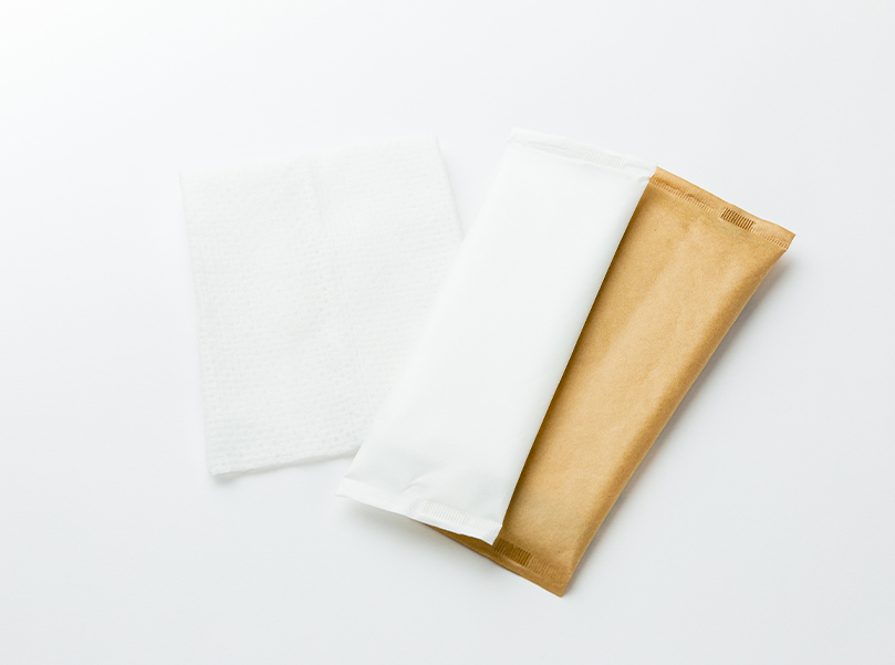 紙おしぼりの「安っぽさ」を払拭し、布おしぼりと同等の高級感を演出。コットンみたいなフンワリ感が、お肌に優しいおしぼりです。